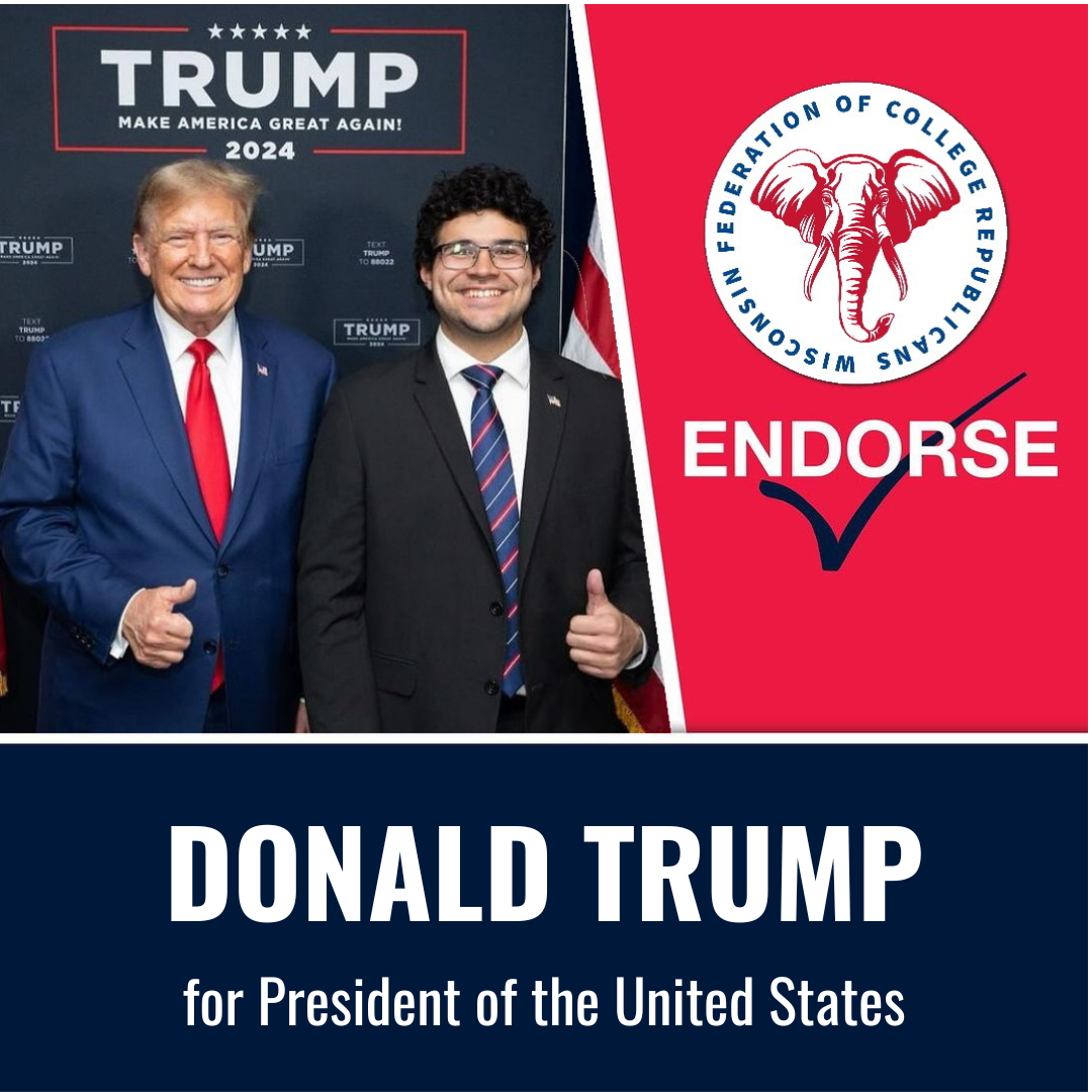On January 1, 2024, the Wisconsin College Republicans endorsed President Donald J. Trump for his bid for the Presidency in November. President Trump reflects the America First values of our federation, membership was ecstatic to issue our endorsement for him. Prior to our official endorsement, our membership volunteered with his team for phone banking as well as a Commit to Caucus event in Cedar Rapids, here Chairman Billy Blathras and Vice Chairman Kaden Crapp were able to be photographed with President Trump. Following our endorsement, the federation sent two dozen members to Iowa in order to volunteer for his campaign, with the opportunity to meet President Trump being open to more members. The entire organization is committed to President Trump turning Wisconsin red this November!